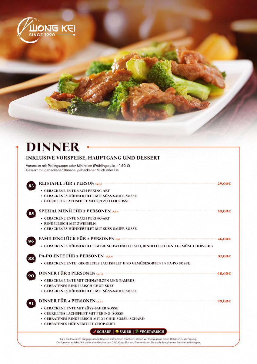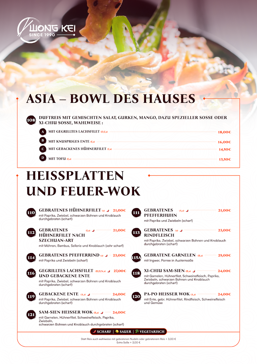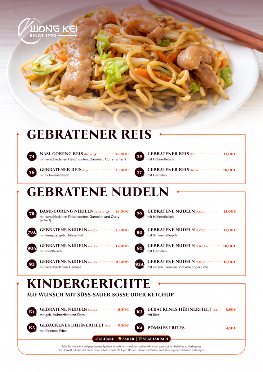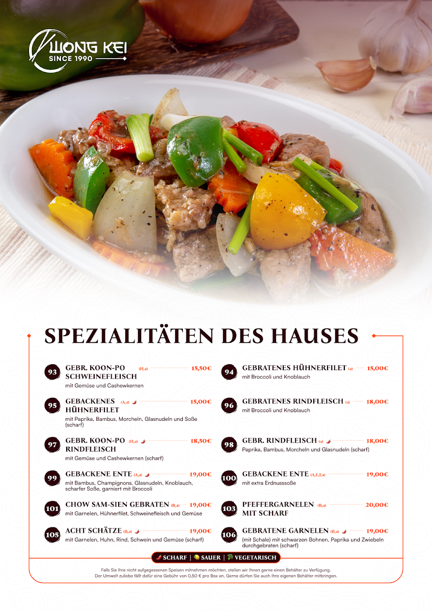 The menu at China-Restaurant Wong-Kei offers a wide variety of flavorful dishes, each crafted with care to bring out the best of Chinese cuisine. Among the standout options, Curry Ente is a must-try for those who enjoy tender duck paired with a rich, spicy curry sauce. For a more intense flavor, the Schweinefleisch Szechuan Art Scharf delivers a bold combination of spicy pork with Szechuan peppercorns, providing a fiery yet satisfying experience. If you're in the mood for something crispy, the Schweinefleisch Scharf Gebackenes Hühnchen Mit Bratnudeln Und Ente Pa Poe offers a delicious mix of spicy pork, crispy chicken, and duck served alongside fried noodles.