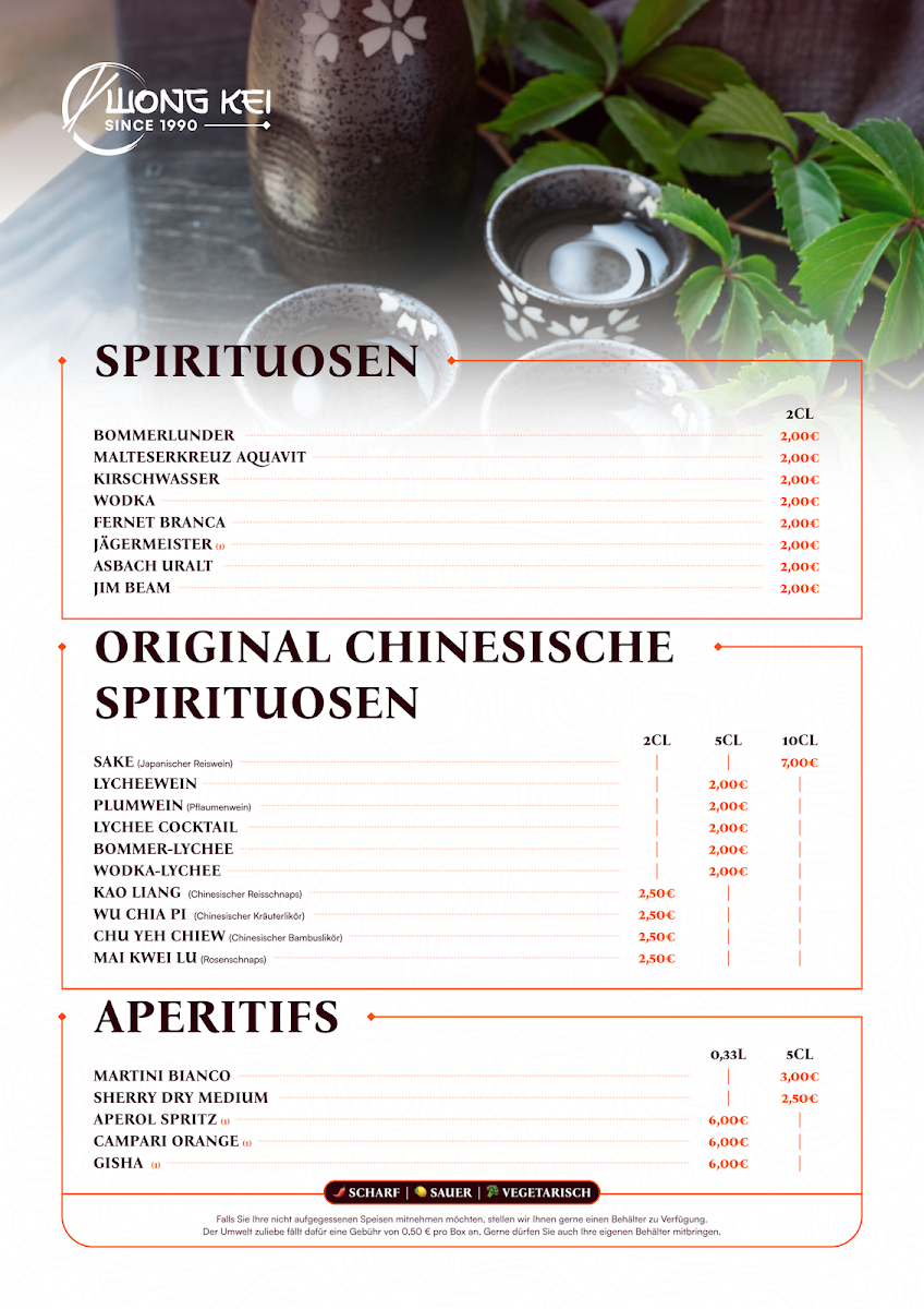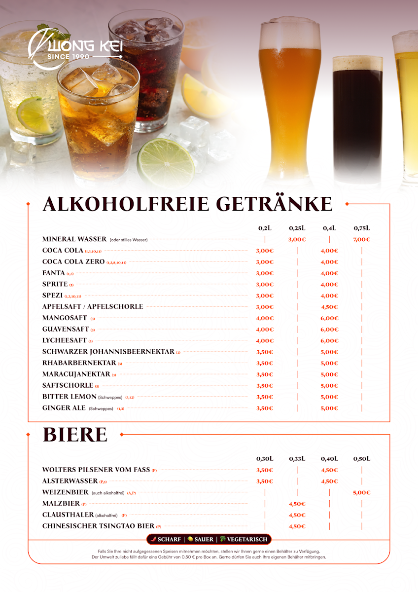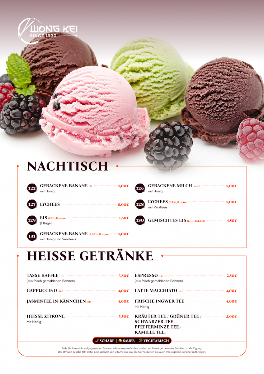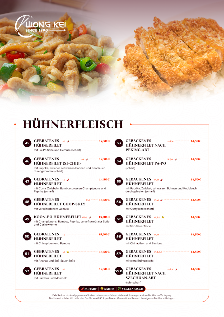 The menu at China-Restaurant Wong-Kei offers a wide variety of flavorful dishes, each crafted with care to bring out the best of Chinese cuisine. Among the standout options, Curry Ente is a must-try for those who enjoy tender duck paired with a rich, spicy curry sauce. For a more intense flavor, the Schweinefleisch Szechuan Art Scharf delivers a bold combination of spicy pork with Szechuan peppercorns, providing a fiery yet satisfying experience. If you're in the mood for something crispy, the Schweinefleisch Scharf Gebackenes Hühnchen Mit Bratnudeln Und Ente Pa Poe offers a delicious mix of spicy pork, crispy chicken, and duck served alongside fried noodles.