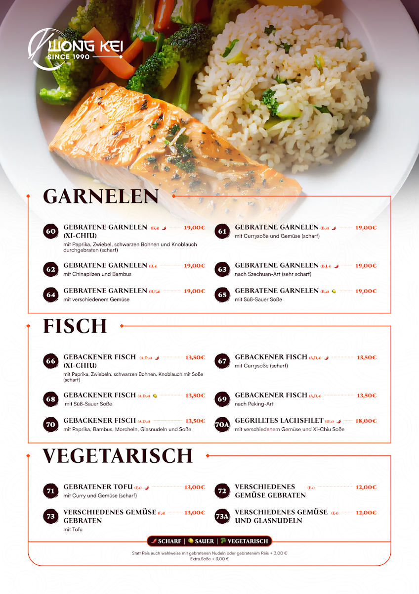 Vegetarians will appreciate the Peking Gemüsesuppe, a fragrant vegetable soup that captures the essence of traditional Peking cuisine. For seafood lovers, the Lachs is a flavorful choice, while the Garnelen Rindfleisch Mit Geműse combines shrimp and beef with a mix of vegetables in a savory sauce, offering a balance of protein and freshness. Another great option is the Hähnchenbrustfilet Kross Mit Bratnudeln, a crispy chicken breast filet served with fried noodles, providing a satisfying crunch with every bite.